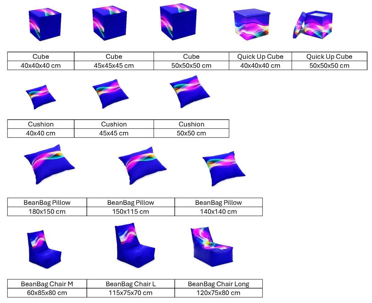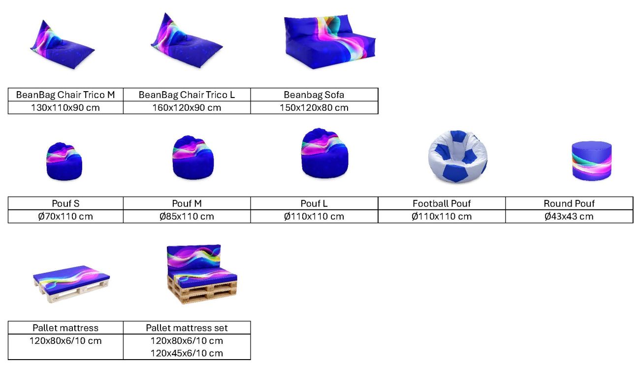 Our bean bags and cubes are made of polyester fabric or reinforced PVC which makes that they are resistant to abrasion and allows to print your deisgn on them. Depending on the material printing is made either by sublimation or by solvent printing.